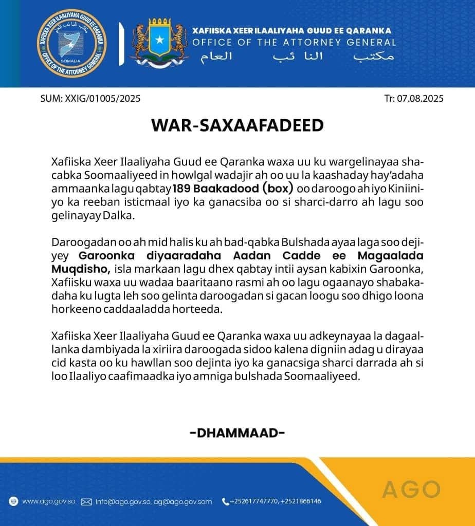 Khamiis 07 Aug 2025 {HMC} Xafiiska Xeer Ilaaliyaha Guud ee Qaranka oo kaashanaya Laamaha Amniga oo Garoonka Aadan Cadde ku qabtay 189 Kartoon oo lagu soo qariyay Daroogo noocyo kala duwan ah iyo kaniiniyaal Isticmaalkooda ka reeban yahay gudaha dalka kuwaa la doonayay in dalka lasoo galiyo.