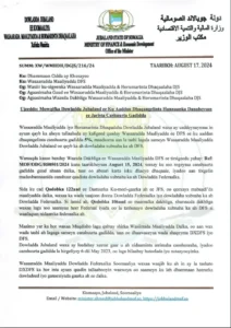 Sabti 17, Aug 2024 {HMC} Wasaaradda Maaliyadda iyo Horumarinta Dhaqaalaha Dowladda Jubbaland ayaa cadaysay mowqifkeeda ku aadan dhaqangalinta canshuurta gadidda 5% ee ay bilowday Wasaaradda Maaliyadda XFS.