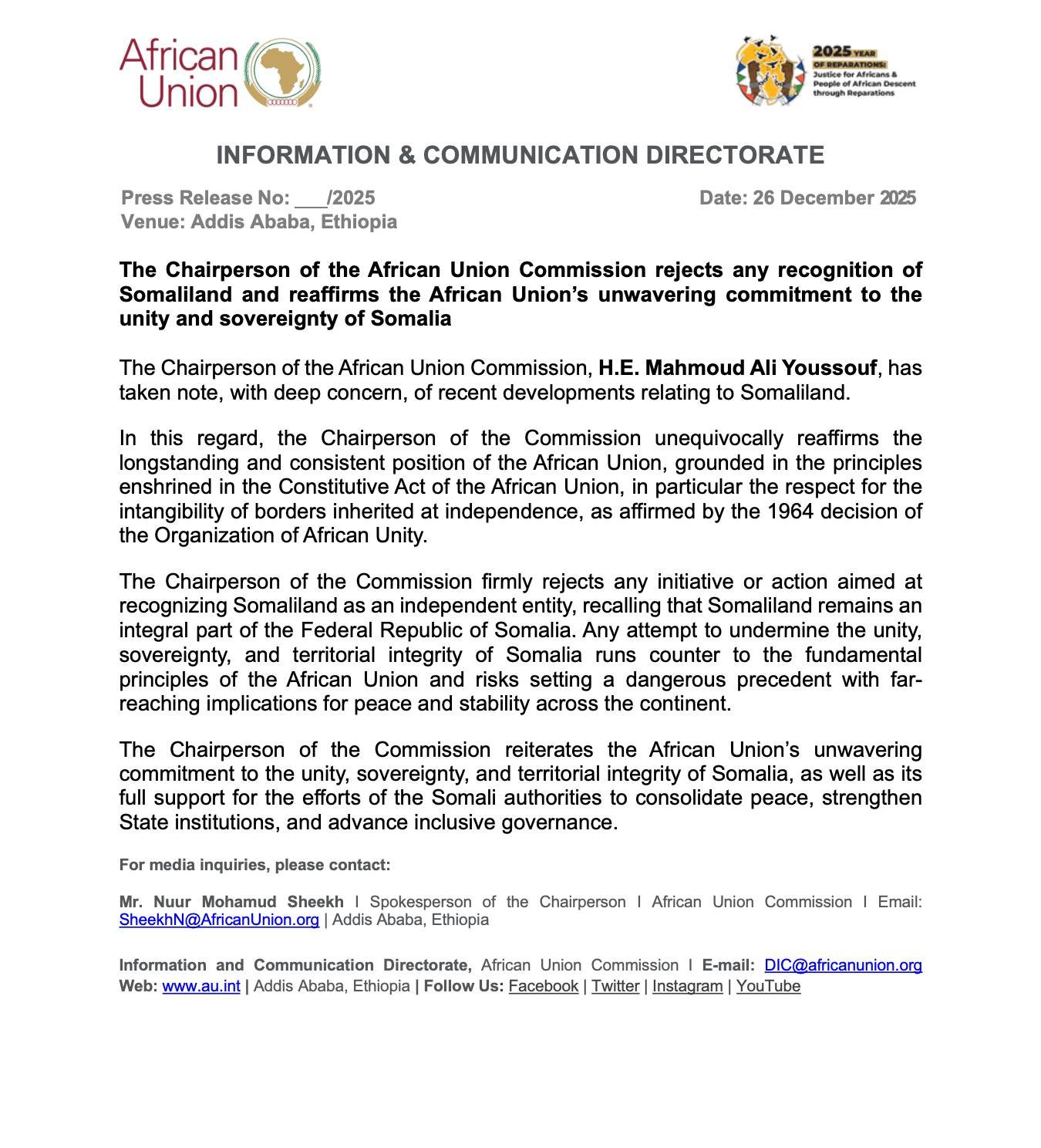 Friday 26 Dec , 2025 {HMC} The Chairperson of the African Union Commission rejects any recognition of Somaliland and reaffirms the African Union’s unwavering commitment to the unity and sovereignty of Somalia.
