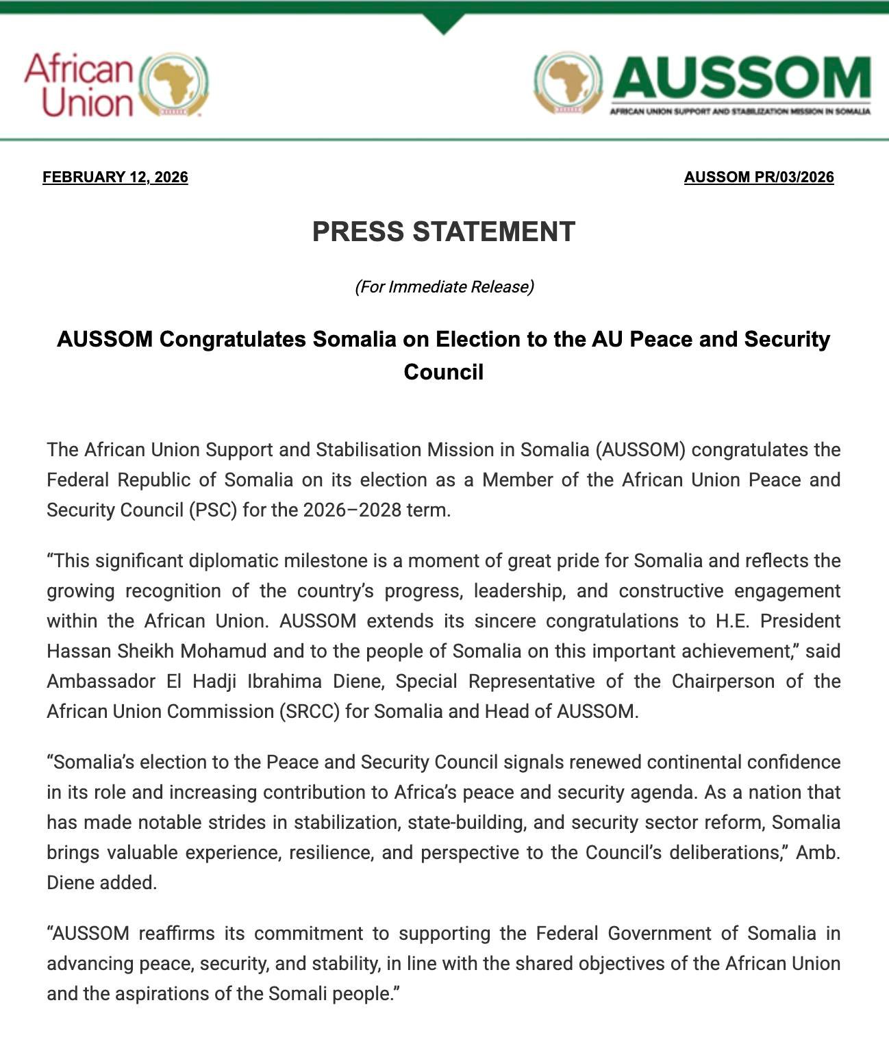 Thusday 12 Feb 2026 {HMC} The African Union Support and Stabilisation Mission in Somalia (AUSSOM) congratulates the Federal Republic of Somalia on its election as a Member of the African Union Peace and Security Council (PSC) for the 2026–2028 term.