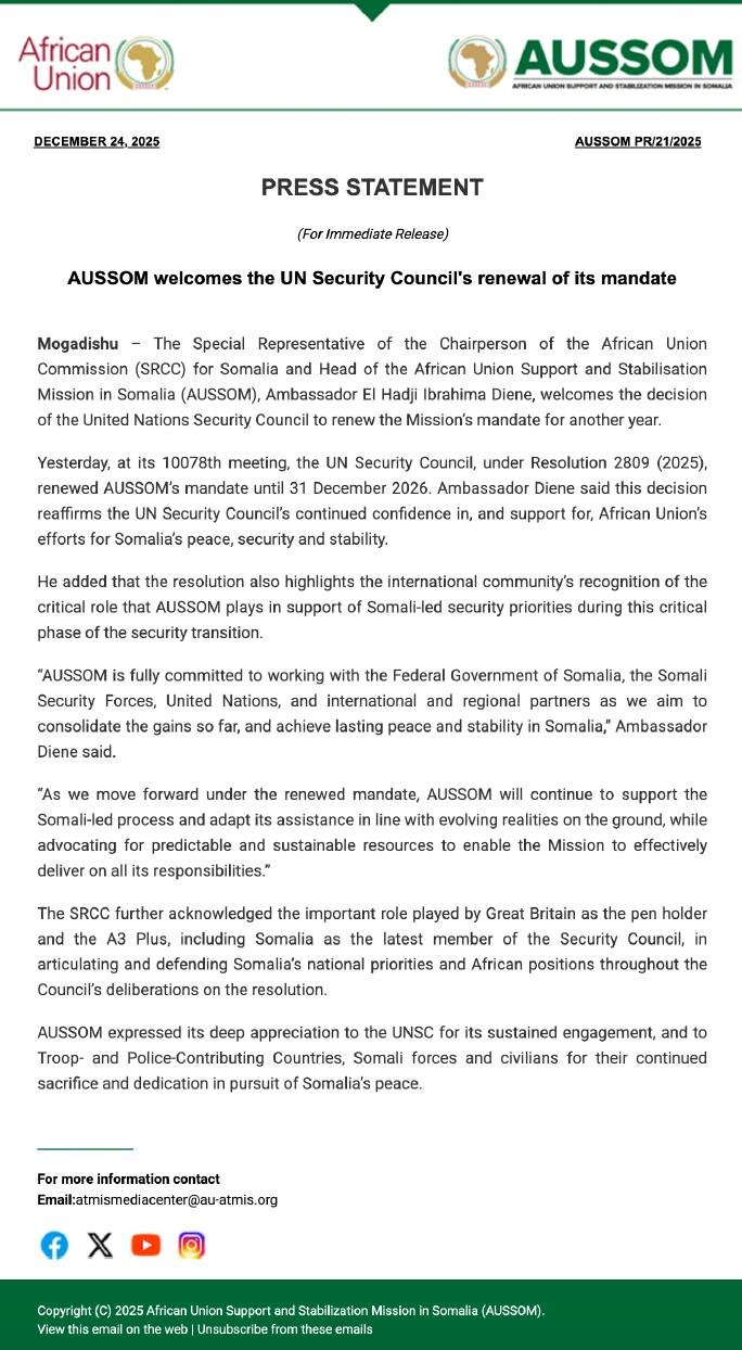 Wednesday 24, Dec 2025 {HMC} The Special Representative of the Chairperson of the African Union Commission (SRCC) for Somalia and Head of the African Union Support and Stabilisation Mission in Somalia (AUSSOM), Ambassador El Hadji Ibrahima Diene, welcomes the decision of the United Nations Security Council to renew the Mission’s mandate for another year.