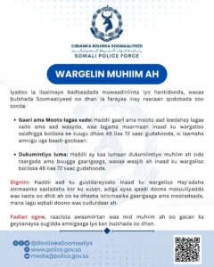 Khamiis 24-Oct-2024 {HMC} Taliska ciidanka booliiska Soomaaliya ayaa qoraal ay soo saareen ku wargaliyay shacabka Soomaaliyeed in kusoo wargaliyaan ciidanka booliiska, haddii gaari ama mooto laga dhaco .