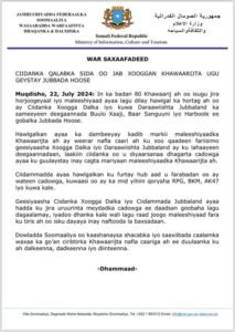 Dowladda Soomaaliya oo kaashanaysa shacabka iyo saaxiibada caalamka waxaa ka go’an ciribtirka Khawaarijta nafla caariga ah ee duulaanka ku ah dalkeenna, dadkeenna iyo diinteen”