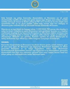Arbaco 11, Sept,2024 {HMC} War-saxaafadeed kasoo baxay taliska ciidanka PSF ee fadhigooda yahay magaalada Boosaaso , ayaa looga hadlay amar garoonka diyaaradaha magaalada looga mamnuucay in ay wax kala soo degaan ama kala duullaan ciidamada PSF.