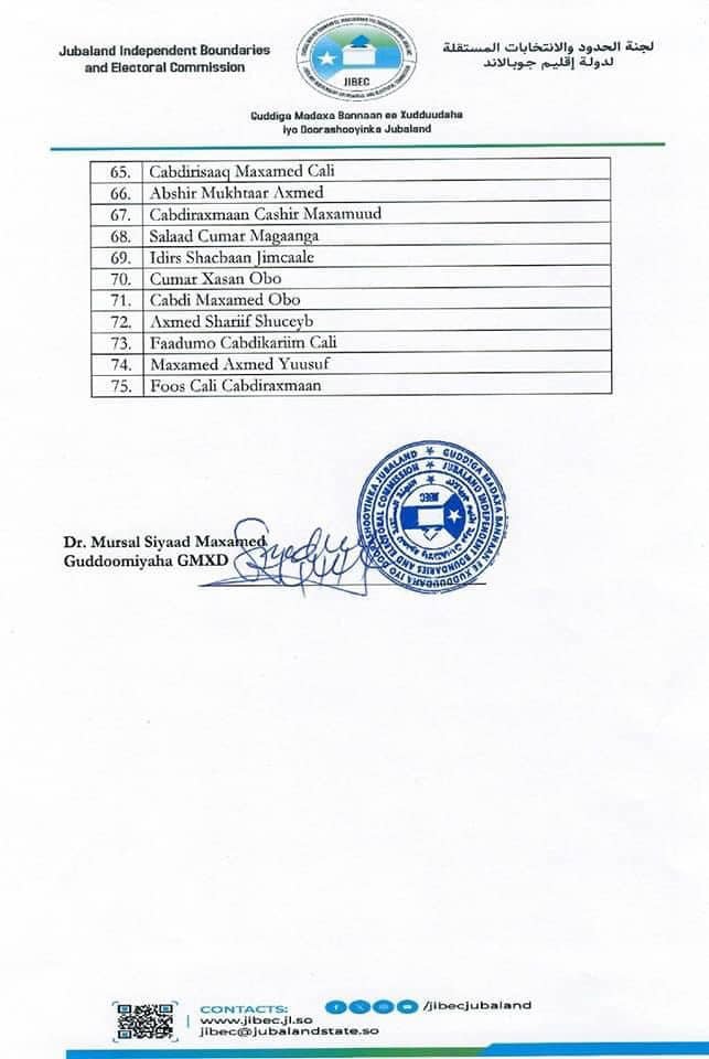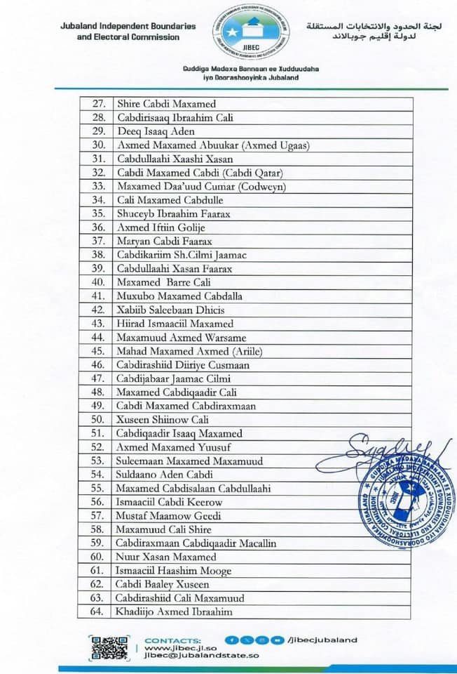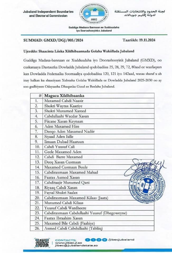 Talaado 19, Nov 2024 {HMC} liiska xildhibaanada cusub ee baarlamaanka Maamulka Jubbaland ayaa goor dhaw la shaaciyay kadib markii odayaasha ay ku wareejiyeen gudigii doorashada ee dhawaan uu magacaabay Axmed Madoobe.
