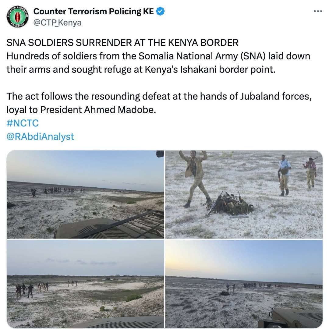 Arbaco 11, Dec 2024 {HMC} Sida lagu daabacay bogga X ee Waaxda la dagaalanka Argagixisada u qaabilsan Kenya, Boqolaal kamid ah ciidamada xoogga dalka SNA ayaa isku dhiibay ciidanka Kenya