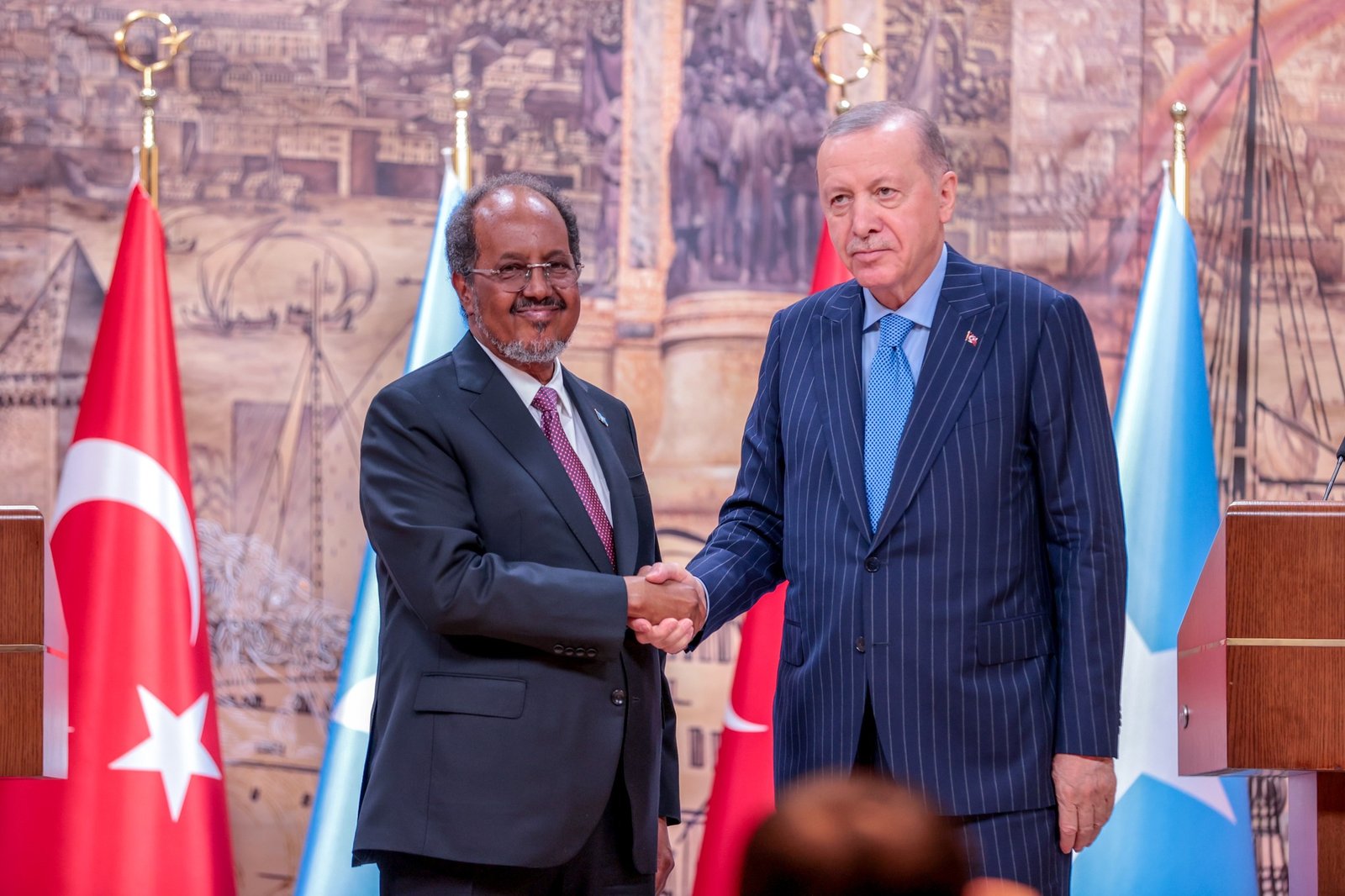 Talaado 30, Dec 2025 {HMC} Madaxweynaha Jamhuuriyadda Federaalka Soomaaliya Mudane Xasan Sheekh Maxamuud iyo dhiggiisa Jamhuuriyadda aan walaalaha nahay Türkiye Mudane Recep Tayyip Erdoğan ayaa magaalada Istanbuul ku qabtay shir jaraa’id oo wadajir ah, kaddib wada-hadallo qotodheer oo ay si gaar ah u yeesheen.