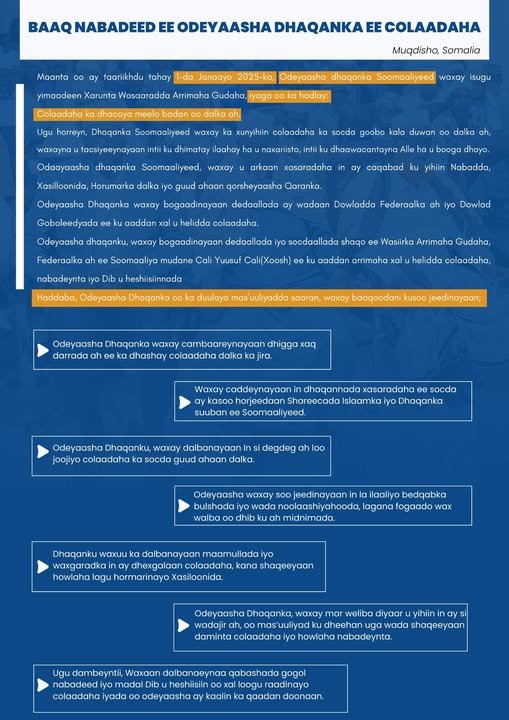 Arbaco 01, January 2025 {HMC}  Odayaasha dhaqanka Soomaaliyeed oo kulan weyne ku qabtay xarunta Wasaaradda Arrimaha Gudaha, Federaalka iyo Dib u heshiisiinta ee XFS, ayaa baaq nabadeed oo ay ku mideysanyihiin kasoo saaray colaadaha ka dhacaya qeybo ka mid ah dalka.
