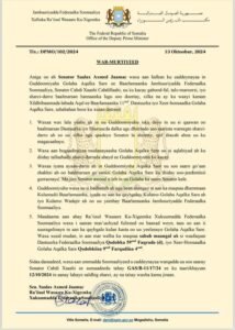 Hoos ka aqriso warqada uu soo saaray Saalah jaamac