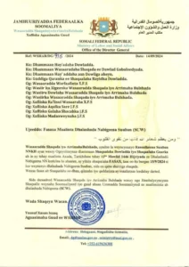 “Wasaaradda Shaqada & Arrimha Bulshada waxey ku wargelineysaa “Fasaxa Maalinta Dhalashada Nabigeena Suuban (SCW)”. Maalinta Axada ah taariikhduna ay ku beegan tahay 12-ka Mowliid 1446-ta Hijriyada, kuna aadan Tr. 15/09/2024 waxaa FASAX ah dhammaan shaqaalaha Soomaaliyeed, si loo weyneeyo maalinta Dhalashadii Nabigeena Suuban NNKH” ayaa lagu yiri qoraal ka soo baxay wasaarada shaqada arrimaha bulshada.