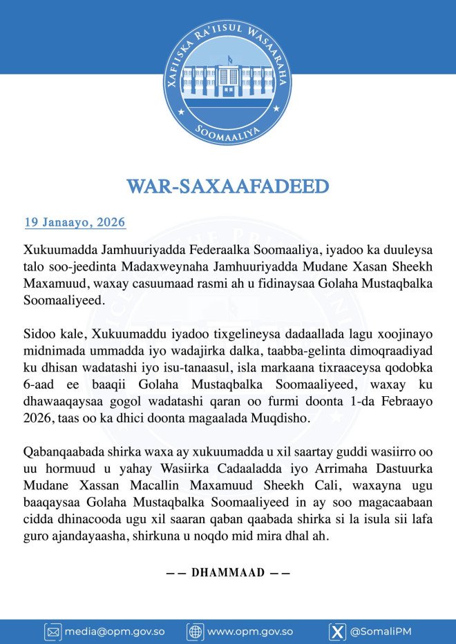 Isniin 19-Jun 2026 {HMC} Xukuumadda Federaalka Soomaaliya ayaa si rasmi ah ugu dhawaaqday waqtiga qabsoomida Shirka u dhaxeeya Dowladda iyo madaxda Mucaaradka ee ku mideeysan Golaha Mustaqbalka Qaranka, si loo dardargeliyo ka doodista siyaasadda guud ee dalka iyo gaar ahaan arrimaha Doorashooyinka