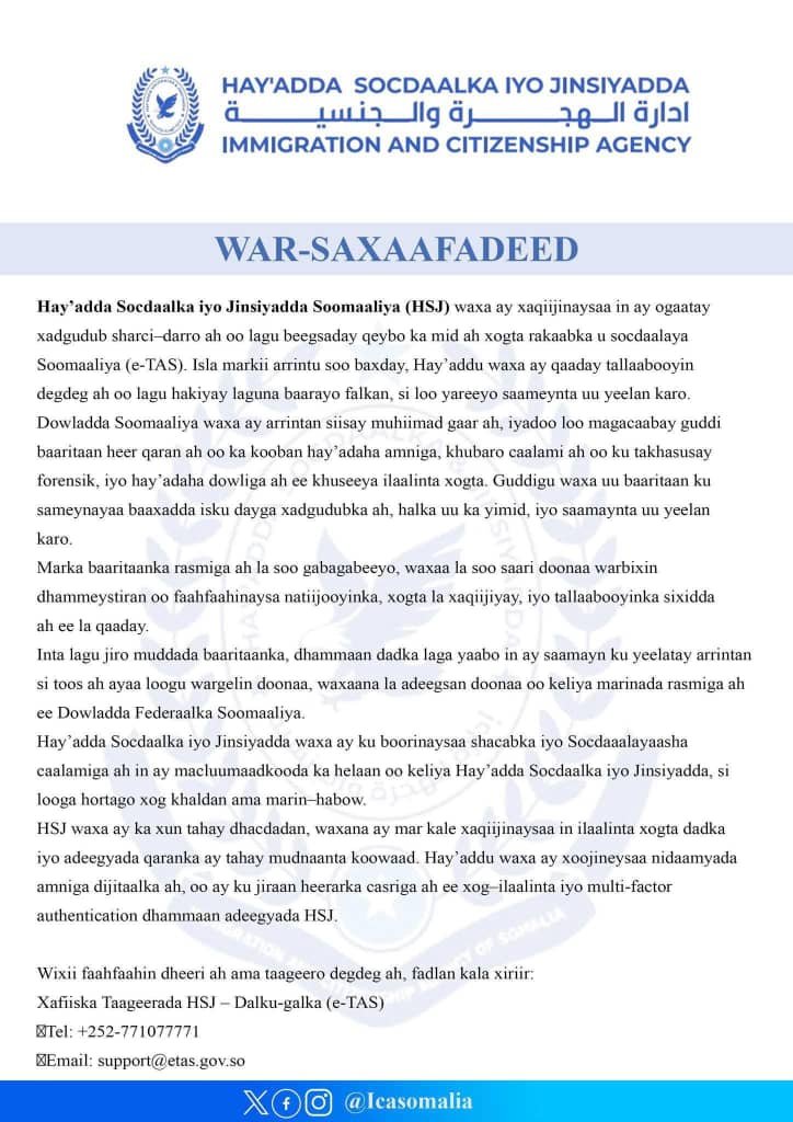 Axad, 16, Nov 2025 {HMC} Dowladda Federaalka Soomaaliya ayaa maanta markii ugu horraysay qirtay in la jabsaday xogtii E-visaha Soomaaliya.