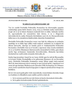 Talaado 24 Feb 2026 {HMC}Wasaaradda Arrimaha Gudaha Soomaaliya ayaa maanta soo saartay war-saxaafadeed rasmi ah oo ay kaga hadlayso halka ay marayaan dadaallada wada-tashiga qaranka iyo caqabadaha soo wajahay wada-hadalladii u dambeeyey ee ka socday Villa Somalia.