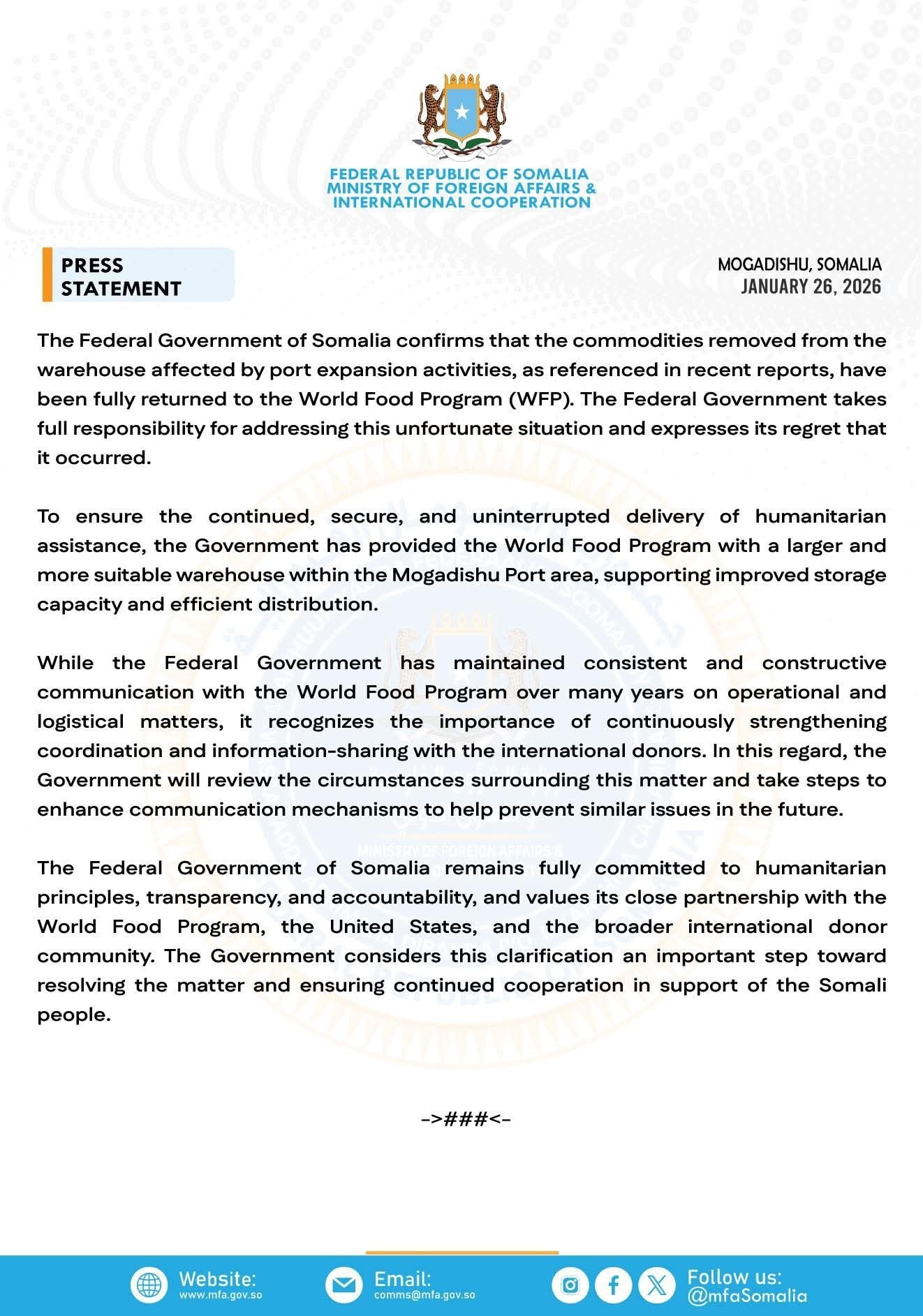 Dowladda Federaalka Soomaaliya ayaa xaqiijisay in dhammaan alaabihii laga saaray bakhaarka dekedda Muqdisho ee saameynta ku yeeshay hawlaha ballaarinta dekedda si buuxda loogu soo celiyey Barnaamijka Cuntada Adduunka (WFP).