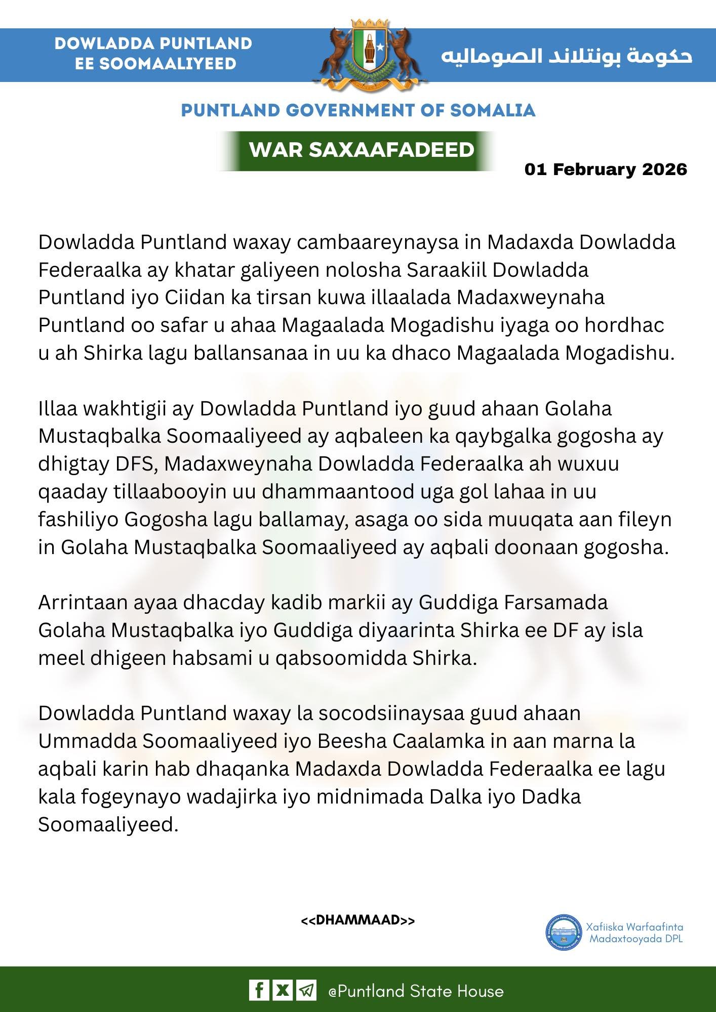 Axad 1 February 2026 {HMC} War kasoo baxay waqti isku mid ah Dowlad-Goboleedyada Puntland iyo Jubbaland ayaa looga hadlay go’aanka Dowladda Federaalka ay maanta dib ugu celisay Diyaarado waday Ciidamo aad u hubaysan oo kasoo duullay Magaalooyinka Garoowe & Kismaayo.