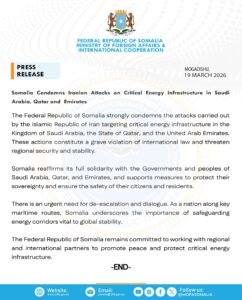Khamiis 19 March 2026 {HMC} Dowladda Federaalka Soomaaliya waxay si adag u cambaaraynaysaa weerarrada ay Iiraan la beegsatay xarruumaha soo saarista tamarta ee dalalka Sacuudiga, Qadar iyo Imaaradka Carabta.