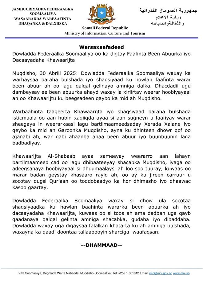 Arbaco 30, April 2025 {HMC} Dowladda Soomaaliya ayaa sheegtay in ay ka warhayso baraha bulshada iyo shaqsiyaad ku howlan faafinta warar been abuur ah oo lagu qalqal gelinayo amniga Soomaaliya gaar ahaan marka ay timaado madaafiicda lagu soo garaaco Muqdisho.
