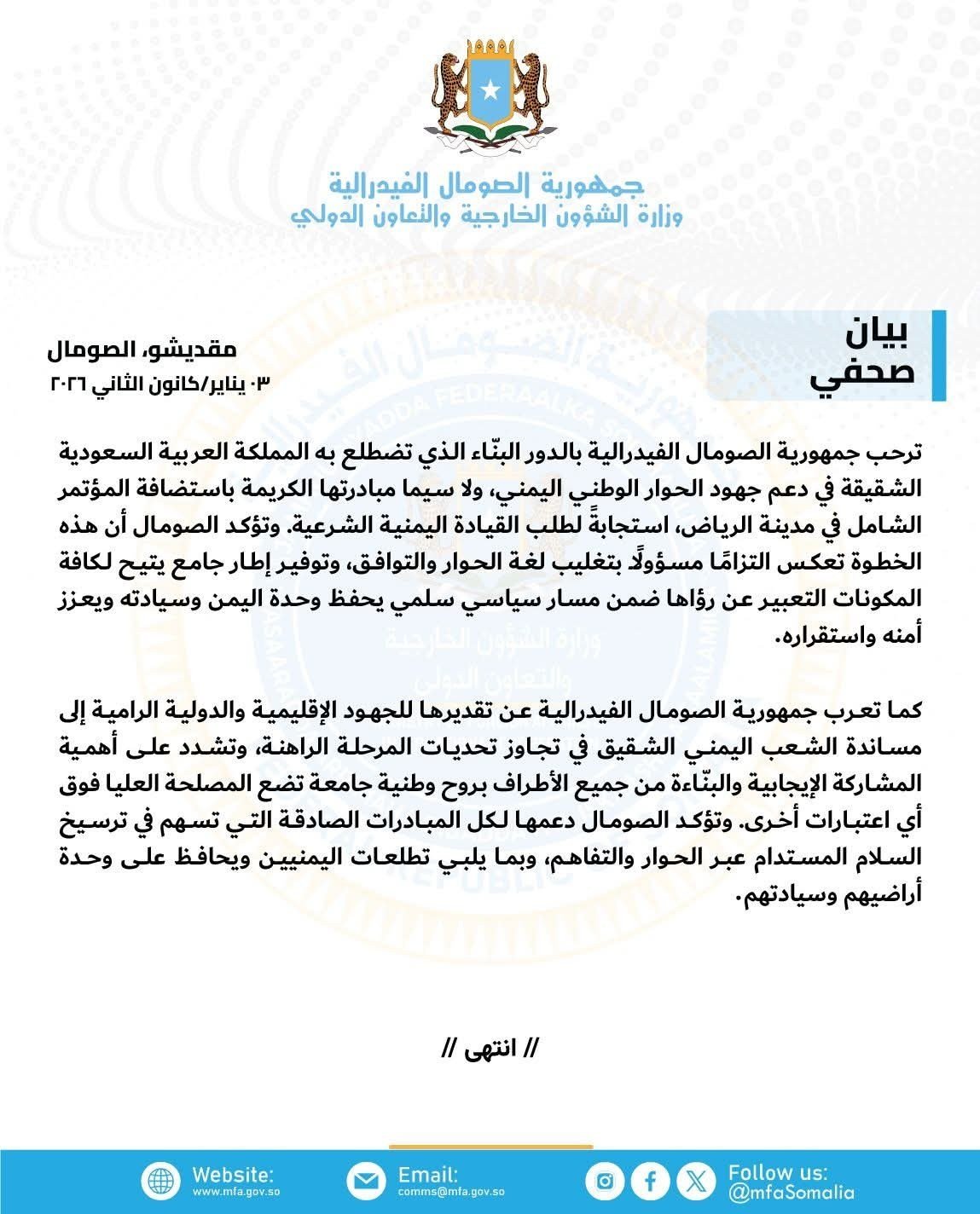 Sabdi 3, Jan 2026 {HMC} Dowladda Soomaaliya ayaa soo dhoweysay doorka Boqortooyada Sacuudi Carabiya ee taageeridda wada-hadalka qaran ee Yemen, gaar ahaan martigelinta shirweyne ka dhacaya Riyadh.