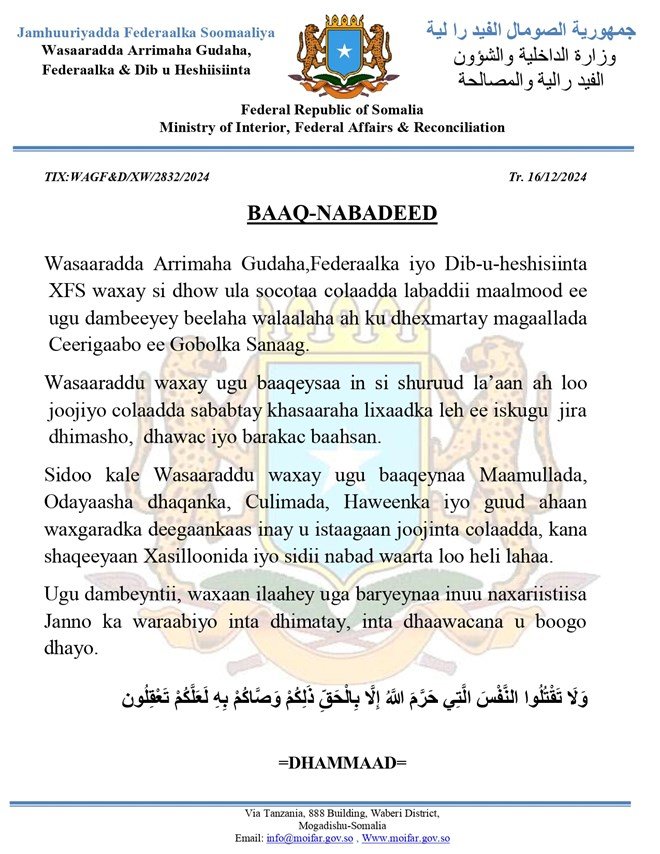 Isniin 16,Dec,2024 {HMC} Wasaaradda Arrimaha Gudaha, Federaalka iyo Dib-u-heshisiinta XFS ayaa sheegtay in ay si dhow ula socoto colaadda labaddii maalmood ee ugu dambeeyey beelaha walaalaha ah ku dhexmartay magaallada Ceerigaabo ee Gobolka Sanaag.