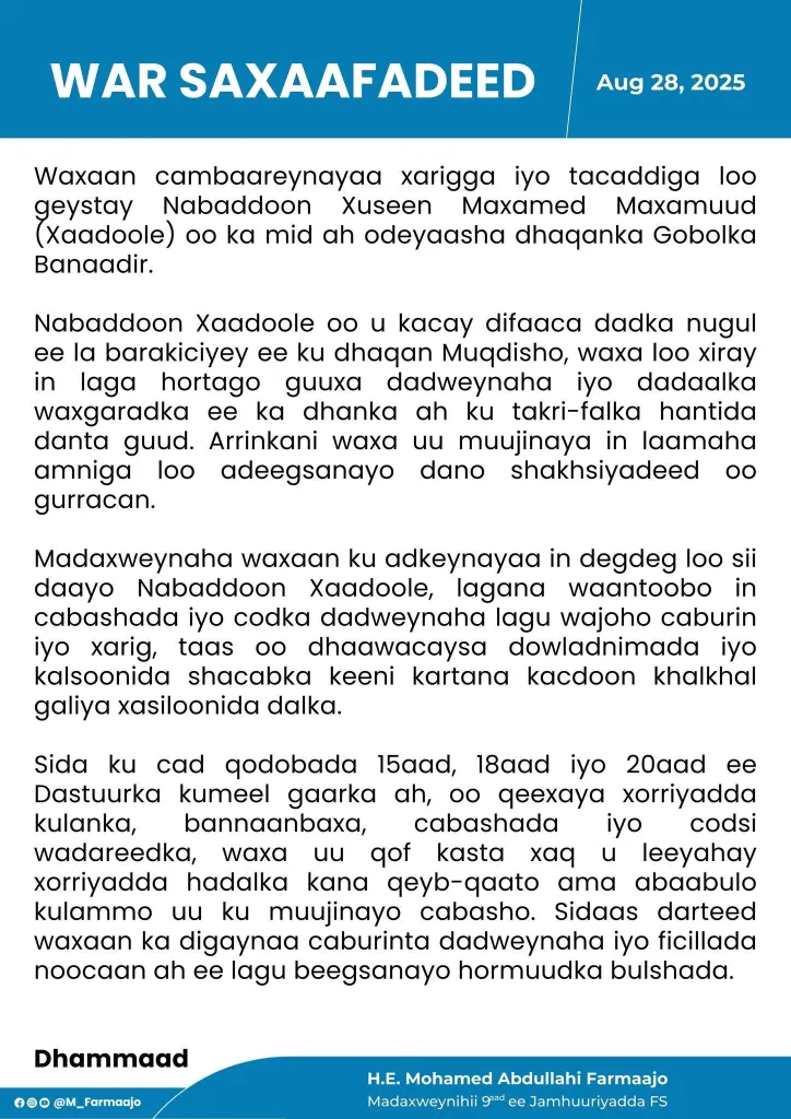 Farmaajo , ayaa ugu baaqay Madaxweynaha in degdeg loo sii daayo Nabaddoon Xaadoole, lagana waantoobo in cabashada iyo codka dadweynaha lagu wajoho caburin iyo xarig, taas uu sheegay in ay dhaawacayso dowladnimada iyo kalsoonida shacabka keeni kartana kacdoon khalkhal galiya xasiloonida dalka.