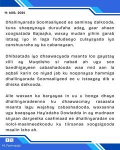 Arbaco 14 /08/ 2024 {HMC} Madaxweeynihii hore ee soomaaliya maxame Abdullaahi farmaajo oo War qoraala soo saaray ayaa si adag uga hadlay dhalinyaradii maanta banaan baxa ka sameeyay muqdisho kidib markii aay sheegen in doowladu lacag kusoo rogtay.