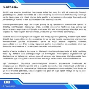 Arbaco 16-10-2024 {HMC} Shirkii uga socday Muqdisho hoggaanka dalka iyo qaar ka mid ah madaxda Dowlad-goboleedyada, Labadii Todabaad ee la soo dhaafay, in uu ku soo dhammaaday fashil iyo natiijo la’aan waa mid niyad jab Iyo kala qaybin u horseedaysa shacabka Soomaaliyeed, jahwareer iyo hubinti la’aan siyaasadeedna ka abuuraysa dalka.