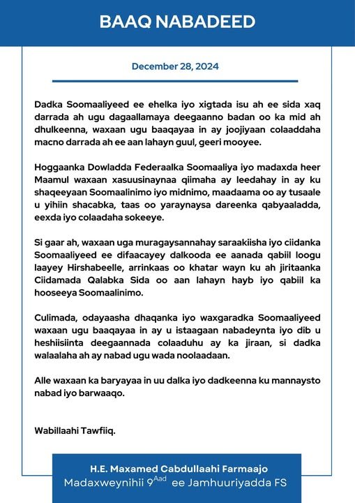 Sabti 28, Dec 2024 {HMC} Dadka Soomaaliyeed ee ehelka iyo xigtada isu ah ee sida xaq darrada ah ugu dagaallamaya deegaanno badan oo ka mid ah dhulkeenna, waxaan ugu baaqayaa in ay joojiyaan colaaddaha macno darrada ah ee aan lahayn guul, geeri mooyee.
