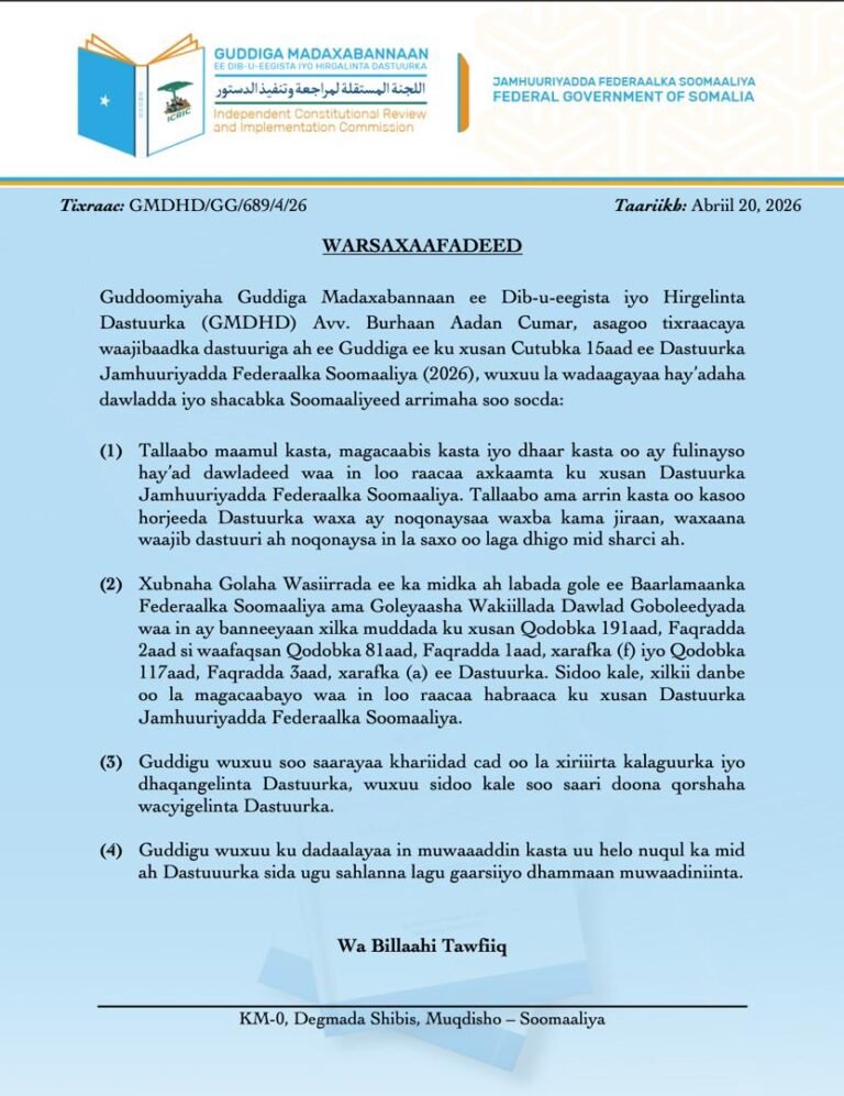 Isniin 20 april 2026 {HMC} Xubnaha Golaha Wasiirrada ee kamidka ah Baarlamaanka Federaalka ayaa lagu amray in ay mid uun doortaan labadaas Xil sida ku xusan Dastuurka cusub ee Dalka, warsaxaafadeed kasoo baxay Guddiga Madaxabannaan ee Dib u eegista & Hirgelinta Dastuurka ayaa sidaasi lagu muujiyay.