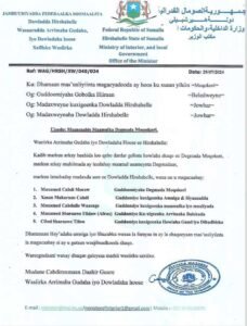 Sabti 3, August 2024 {HMC} Wasiirka Wasaaradda Arimaha Gudaha Hirshabeele Abdi Daahir Guuree Karoore aya Xilkii Ka Qaaday Gudoomiyihii Degmada Maxaas Muumin Maxamed Xalane, Wuxuuna Xilka Gudoomiyaha Degmada Maxaas Umagacaaway Ciise Mohamud Cabdi.