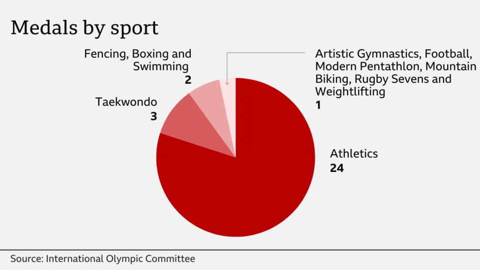That is an increase of two medals on the tally in Japan three years ago but below the 45 which African competitors secured at Rio 2016.