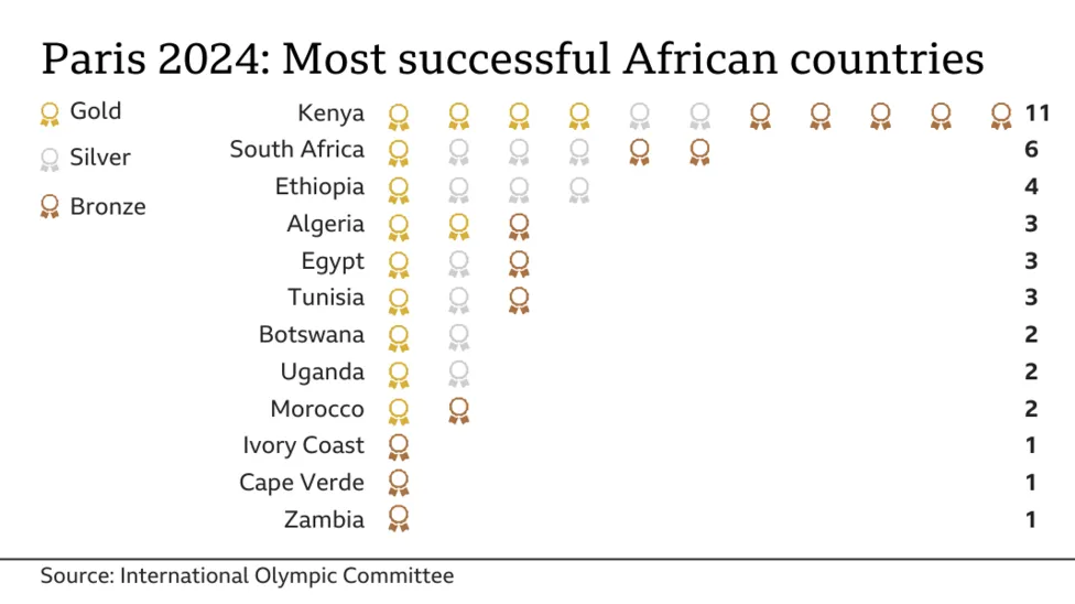 DR Congo, Tanzania and Sudan are also in the top 10 African countries by population and failed to get on the medal table, while contingents from Cameroon and Ghana also returned home empty handed.