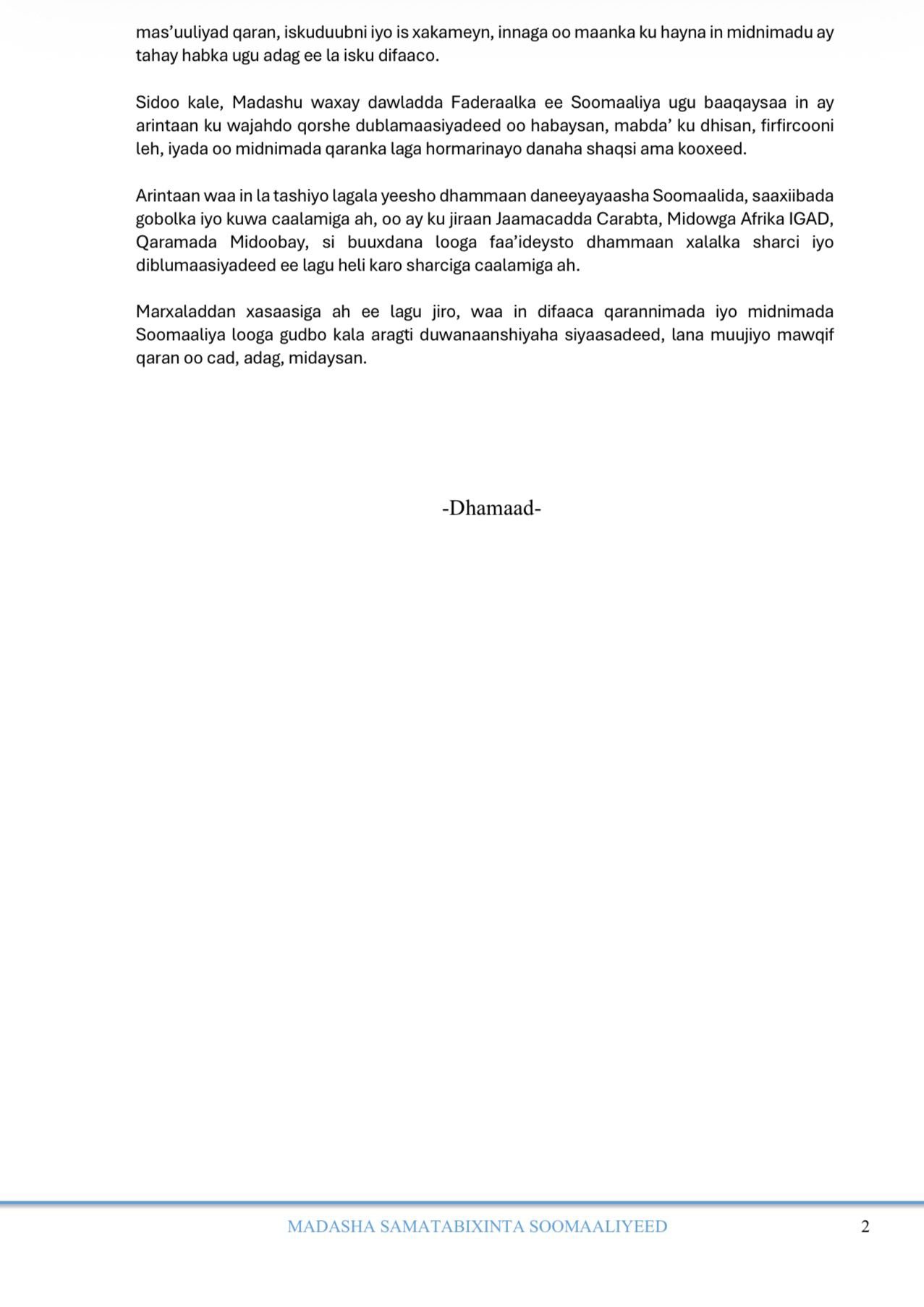 Jimco 26 Dec , 2025 {HMC} Madashada samatabixinta oo ay ku mideysanyihiin hoggaamiyeyaasha siyaasadda ayaa ku baaqay midnimo qaran, iyagoo ka soo horjeestay go’aankii ay Israa’iil ku aqoonsatay Somaliland oo ay ku sheegeen inay meel ka dhac ku tahay madax bannaanida iyo wadajirka dhuleed ee Soomaaliya.