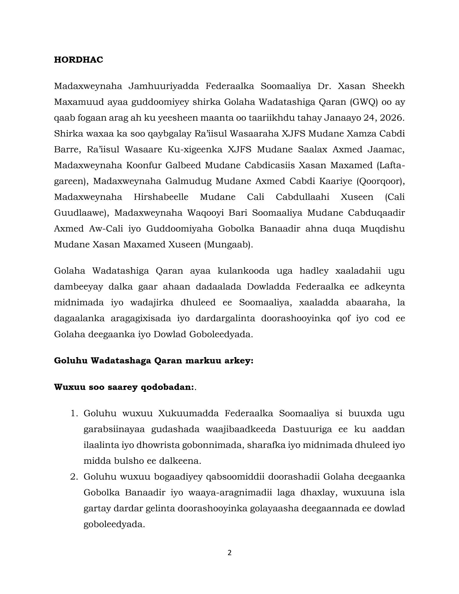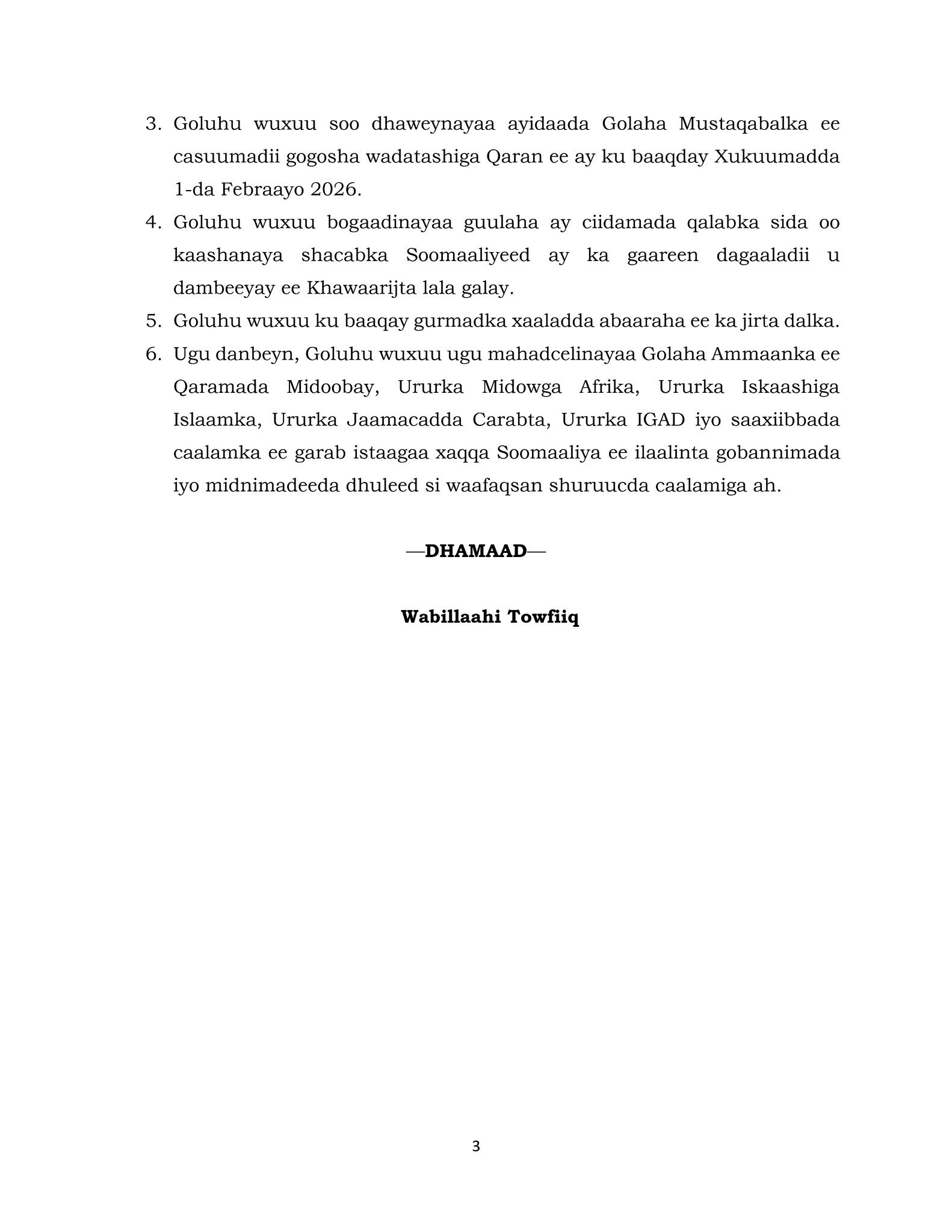 3. Goluhu wuxuu soo dhaweynayaa ayidaada Golaha Mustaqabalka ee casuumadii gogosha wadatashiga Qaran ee ay ku baaqday Xukuumadda 1-da Febraayo 2026.