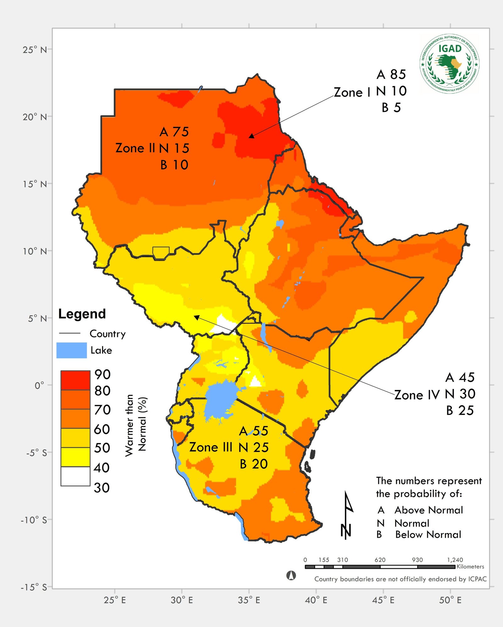 The temperature forecast indicates a higher likelihood of warmer-than-normal conditions across most parts of the Greater Horn of Africa, with the highest probabilities (more than 75%) over Sudan, Ethiopia, Eritrea, Djibouti, northern Somalia, and northern Kenya.