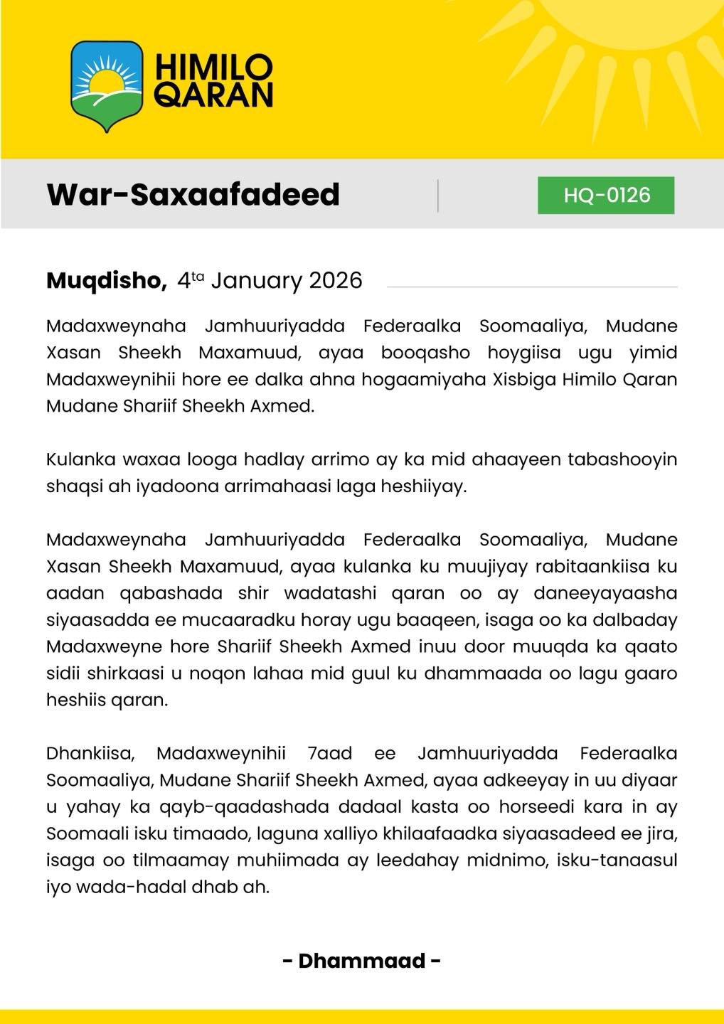 Dhankiisa, Madaxweynihii 7aad ee Jamhuuriyadda Federaalka Soomaaliya, Mudane Shariif Sheekh Axmed, ayaa adkeeyay in uu diyaar u yahay ka qayb-qaadashada dadaal kasta oo horseedi kara in ay Soomaali isku timaado, laguna xalliyo khilaafaadka siyaasadeed ee jira, isaga oo tilmaamay muhiimada ay leedahay midnimo, isku-tanaasul iyo wada-hadal dhab ah.
