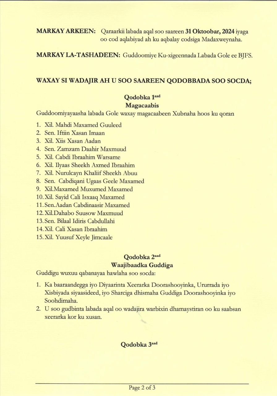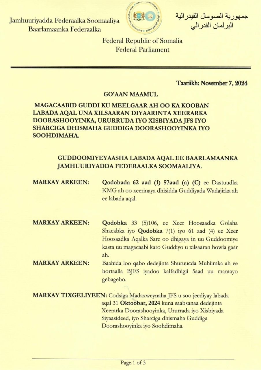 Khamiis 7, Nov 2024 {HMC} Guddoonka labada Aqal ee Baarlamaanka Jamhuuriyadda Federaalka Soomaaliya ayaa magacaabay guddi Kumeel gaar ah oo ka kooban labada Aqal ee Baarlamaanka Dalka kaasoo u xilsaaran diyaarinta xeerarka doorashooyinka, Ururada iyo Xisbiyadda Jamhuuriyadda Federaalka Soomaaliya iyo sharciga dhismaha guddiga doorashooyinka iyo sidoo kale soohdimaha.