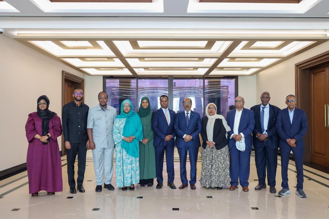 Mogadishu, 16, Oct 2025, the President of the Federal Republic of Somalia, His Excellency Hassan Sheikh Mohamud, received at the Presidential Palace the new Members of Parliament who will represent Somalia in the East African Economic Cooperation (EAC) Parliament, accompanied by the Minister of Foreign Affairs, His Excellency Abdisalam Abdi Ali.