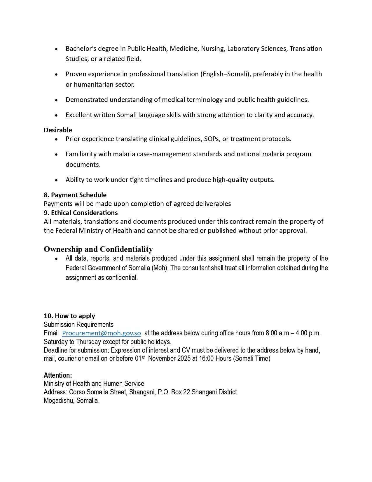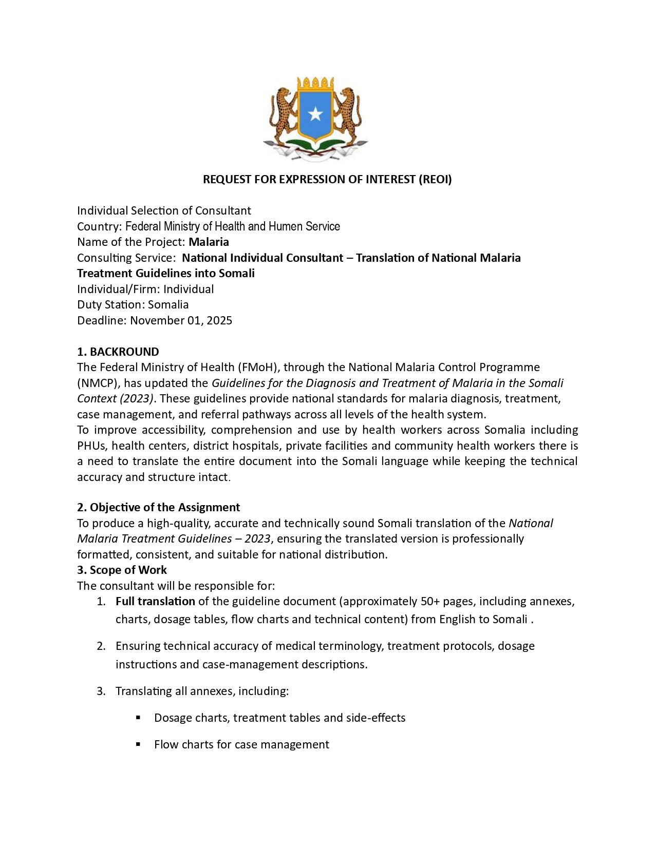 SPORTS REQUEST FOR EXPRESSION OF National Consultant. By cabdiraxmaan Macalin Muuse - 25 October 2025 0 51 Share FacebookXWhatsAppTelegram 25 October 2025 {HMC} REQUEST FOR EXPRESSION OF National Consultant Share this: Click to share on Facebook (Opens in new window) Facebook Click to share on X (Opens in new window) X Like this:Like Loading...Share