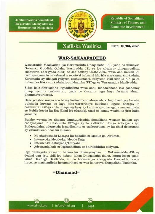 Isniin 10, March 2025 {HMC} Xukuumadda Somaliland ayaa beenisay in cashuur ay kusoo rogtay shirkadaha isgaadhsiinta ay sidoo kale ku waajibayso lacagaha telefoonada layskugu diro, kadib markii warar arrintaas sheegaya ay suuqa soo galeen.
