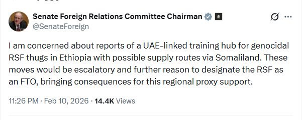 “Waxaan ka walaacsanahay warbixinnada ku saabsan xarun tababar oo lala xiriirinayo Imaaraadka (UAE) oo gudaha Itoobiya loogu furay maleeshiyada xasuuqa geysata ee RSF, iyadoo laga yaabo inay jiraan waddooyin sahayda loo mariyo oo sii mara Somaliland.