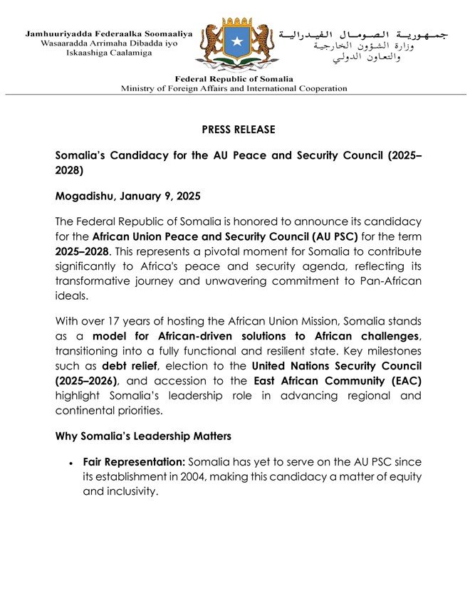 Khamiis 9 Jan 2024 {HMC} Dowladda Soomaaliya ayaa markii ugu horreysay ku dhawaaqday inay u tartamayso kursiga Golaha Nabadda iyo Ammaanka ee Midowga Afrika (AU PSC).