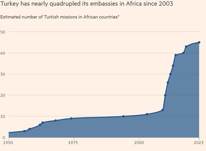 Since 2003, Turkey has nearly quadrupled the number of its embassies in Africa to 44, become a significant actor in the continent’s defence sector and launched a sprawling constellation of airline routes, connecting Istanbul to dozens of African cities that are served by few other international carriers.