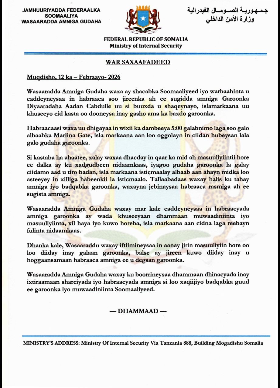 Khamiis 12 Feb 2026 {HMC} Wasaaradda Amniga Gudaha waxay shacabka Soomaaliyeed iyo warbaahinta u caddeyneysaa in habraaca soo jireenka ah ee sugida amniga Garoonka Diyaaradaha Aadan Cabdulle uu si buuxda u shaqeynayo, islamarkaana uu khuseeyo cid kasta oo dooneysa inay gasho ama ka baxdo garoonka.