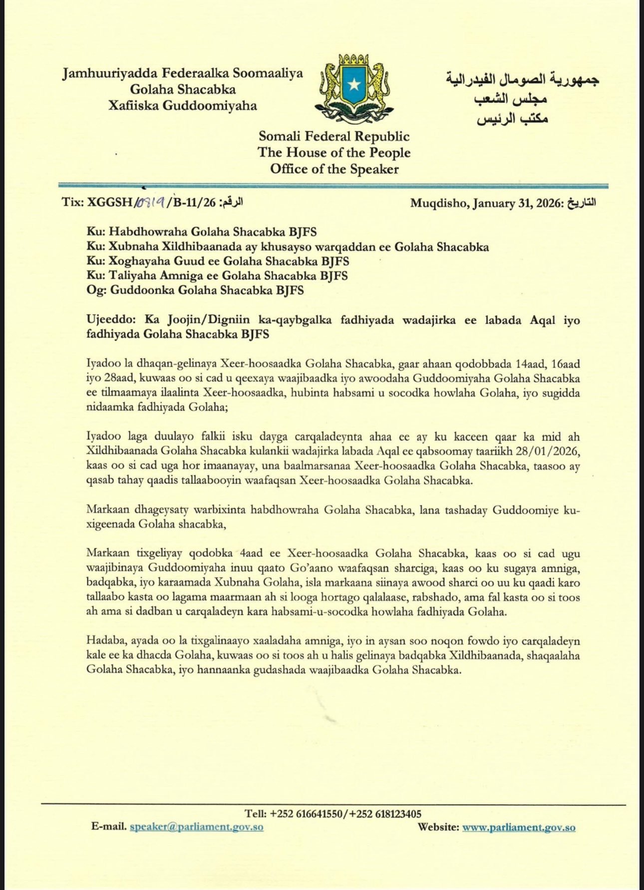 Axad 1 February 2026 {HMC} Guddoomiyaha Golaha Shacabka Baarlamaanka JFS, Sheekh Aadan Maxamed Nuur Madoobe ayaa qoraal uu soosaaray ku ganaaxay Xildhibaanno katirsan Golahaas oo 28kii Janaayo 2026 rabshad ka dhex sameeyay kulankooda oo ugu danbayn lagu kala tagay.